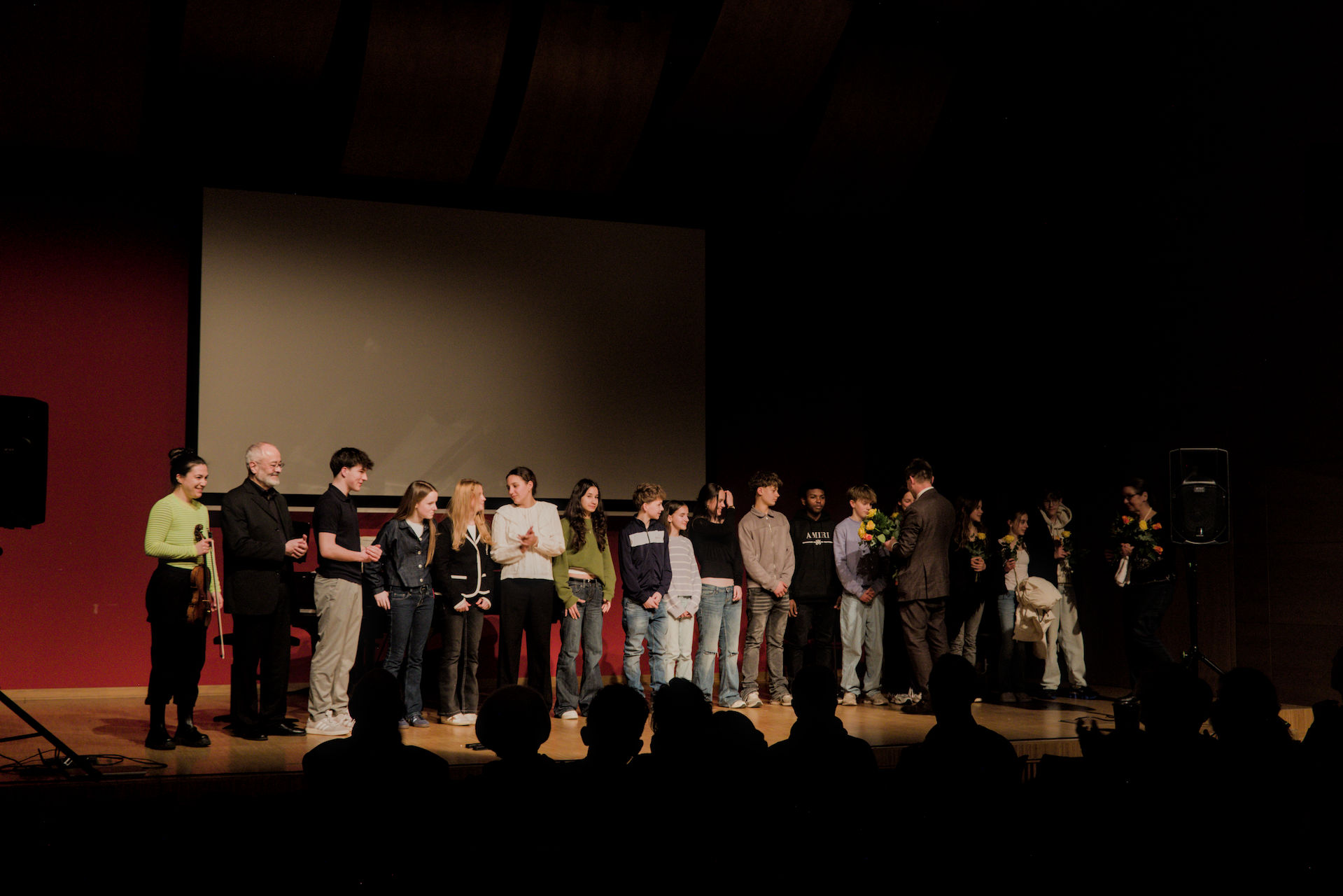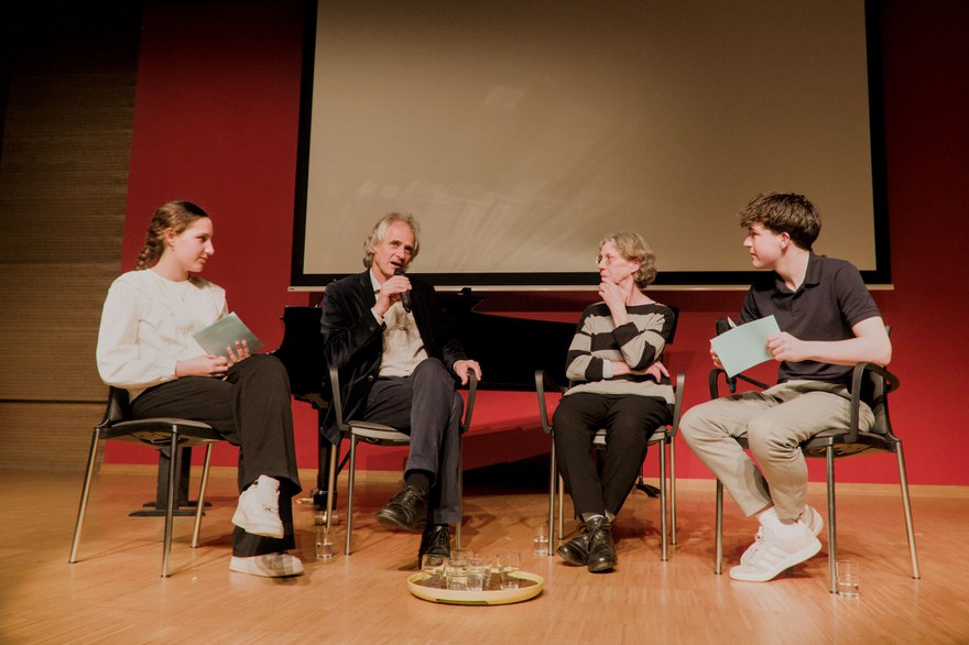 Mit klugen und einfühlsamen Fragen entlockten Josephin und Elias ihren Gesprächspartnern im Rahmen eines zwanzigminütigen Podiumsgesprächs spannende und berührende Einblicke in schöne und schwierige Momente und Lebensphasen ihrer eigenwilligen Väter. Am Ende des Konzerts bedankte sich das Publikum bei der Geigerin und dem Pianisten, den Komponistenkindern sowie den Schülerinnen und Schülern der Klasse 8.9 mit enthusiastischem Applaus für zwei hochinteressante Stunden, die in der abwechslungsreichen Verbindung von Musik, Texten und Bildern, Video und Gesprächen in jeder Sekunde intensiv und fesselnd waren.