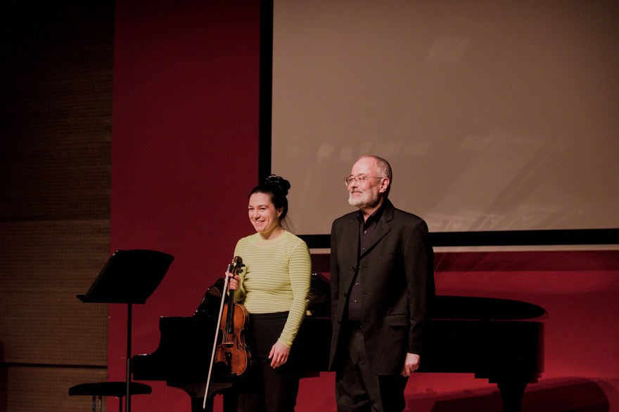 Dort stellten die Geigerin Anna Neubert und der Pianist Paulo Álvares hochkomplizierte Solo- und Kammermusikwerke aus unterschiedlichen Schaffensphasen der beiden Komponisten einander gegenüber: Zimmermanns Konfigurationen für Klavier und Stockhausens Klavierstück IX sowie Stockhausens Sonatine für Violine und Klavier und Zimmermanns Sonate für Violine und Klavier. Dazwischen erklangen zwei elektronische Raumkompositionen, die beide 1970 auf der Weltausstellung in Osaka in einem speziell gebauten Konzertsaal, dem Kugelauditorium, gespielt worden waren: Stockhausens Telemusik und Zimmermanns Tratto II.