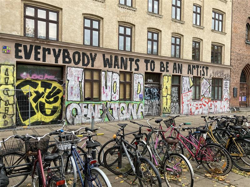Was gehört darüber hinaus erwähnt? Kopenhagen ist schön! Auch wenn das Wetter – meist trocken, gute 10°C, eher wolkenverhangen – sicherlich für die eine oder den anderen zu wünschen übig lässt. Die Zugfahrt hat tadellos funktioniert. Isch schwör' :-) Keinerlei Verspätungen, zwei Stunden mit einem älteren dänischen Herrn gesprochen, ein paar Klausuren korrigiert, die Landschaft vorbeiziehen gelassen. Zehn Stunden muss man oder frau einrechnen, hin und zurück für kaum mehr als 100 Euro. Wahrlich kein schlechtes Reisen, und ganz bestimmt nachhaltig. Nicht zuletzt muss die liebenswerte bunte Truppe Erwähnung finden, bestehend aus vier Spanierinnen aus einer Gefängnisschule (!!) in Sevilla, vier Italienerinnen aus der Nähe von Neapel und drei deutschen Lehrer:innen aus Flensburg, Hannover und Kerpen, angeleitet von unseren dänischen Gastgeber:innen Mette, Peter und Niklas. Mit Englisch, Händen und Füssen und nicht zuletzt viel Lachen funktioniert die Kommunikation hervorragend.