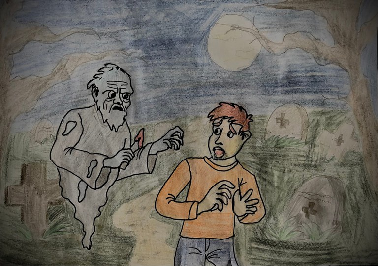 Neun Schüler:innen haben insgesamt am Halloween-Geschichtenwettbewerb teilgenommen. Da hatte die triefnasige Jury – bestehend aus Lu, Hanna, Jakob und Herrn Arnolds (Katharina hat es leider komplett aus der Bahn geworfen) – eine Menge zu tun. So viel vorweg: Die Geschichten sind großartig und alle werden in den kommenden Tagen veröffentlicht, auch und nicht zuletzt ein Comic sowie ein aufwändig erstellter Stopp-Motion-Film.
